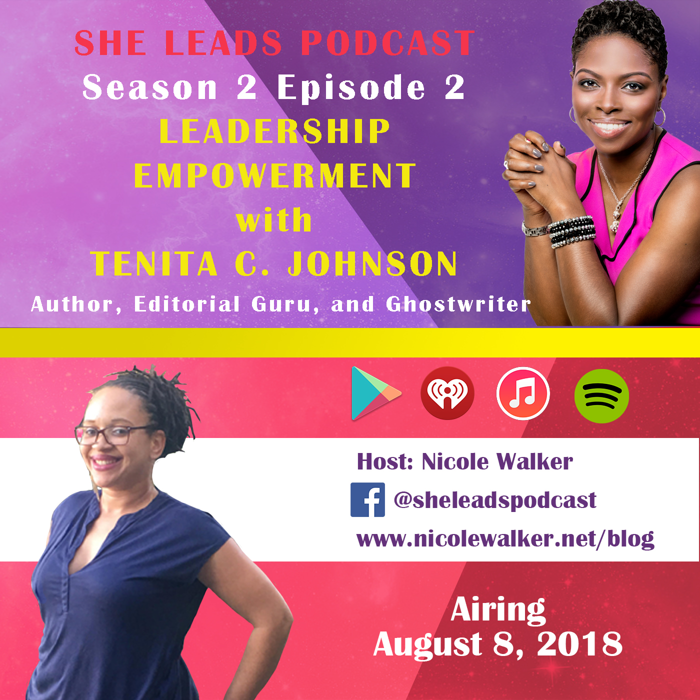 She Leads Podcast: Leadership Empowerment for Women of Color presents Season 2 Episode 2: Leadership Empowerment with Tenita C. Johnson. Gain leadership insight and advice from Tenita C. Johnson an Author, Editorial Guru, and Ghostwriter. Listen in to learn about Tenita’s experiences and lessons on her quest to be an Ultimate Leader!