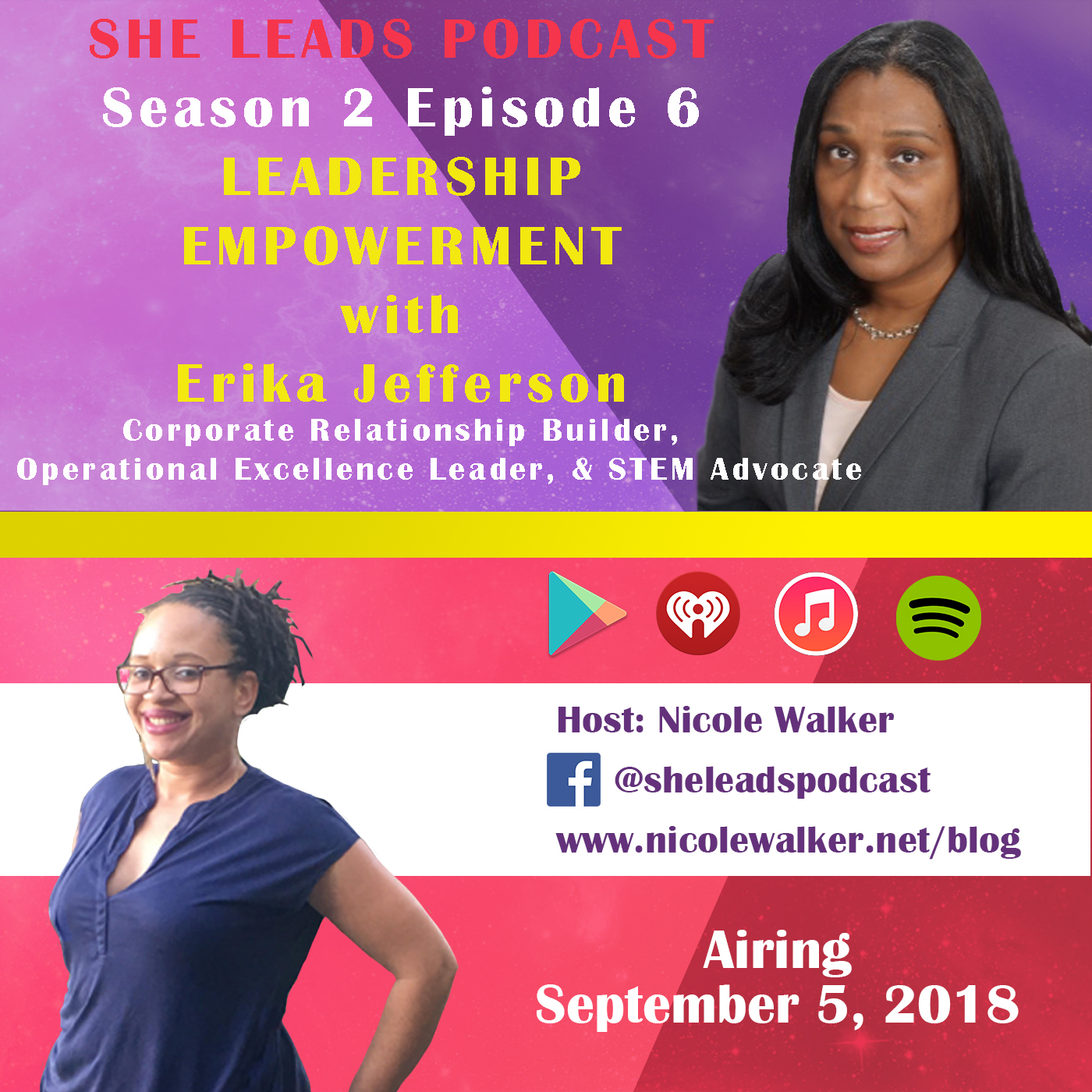 She Leads Podcast: Leadership Empowerment for Women of Color presents Season 2 Episode 6: Leadership Empowerment with Erika Jefferson. Gain leadership insight and advice from Erika Jefferson a Corporate Relationship Builder, Operational Excellence Leader, & STEM Advocate. Listen in to learn about Erika’s experiences and lessons on her quest to be an Ultimate Leader!